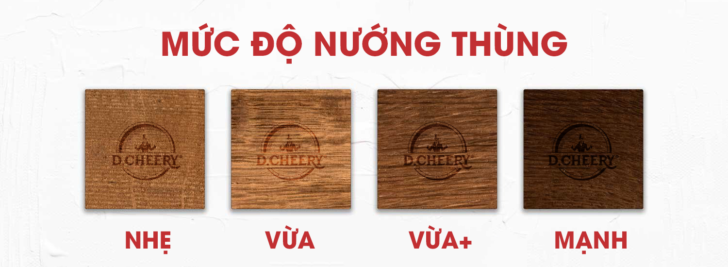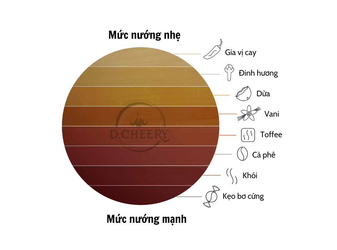 Trong khi đó, mức nướng nặng với thời gian tiếp xúc nhiệt lâu hơn sẽ tạo ra quá trình caramel hóa sâu hơn và mang lại những hương vị đậm đà đặc trưng từ gỗ sồi.