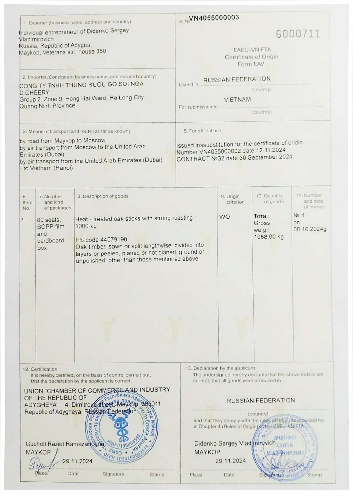 - Nguồn gốc & xuất xứ: Chip gỗ sồi Nga D.Cheery được sản xuất chuyên dụng cho mục đích ngâm ủ rượu. Mọi công đoạn sản xuất được thực hiện trực tiếp tại Nga, sau đó được nhập khẩu về Việt Nam.
