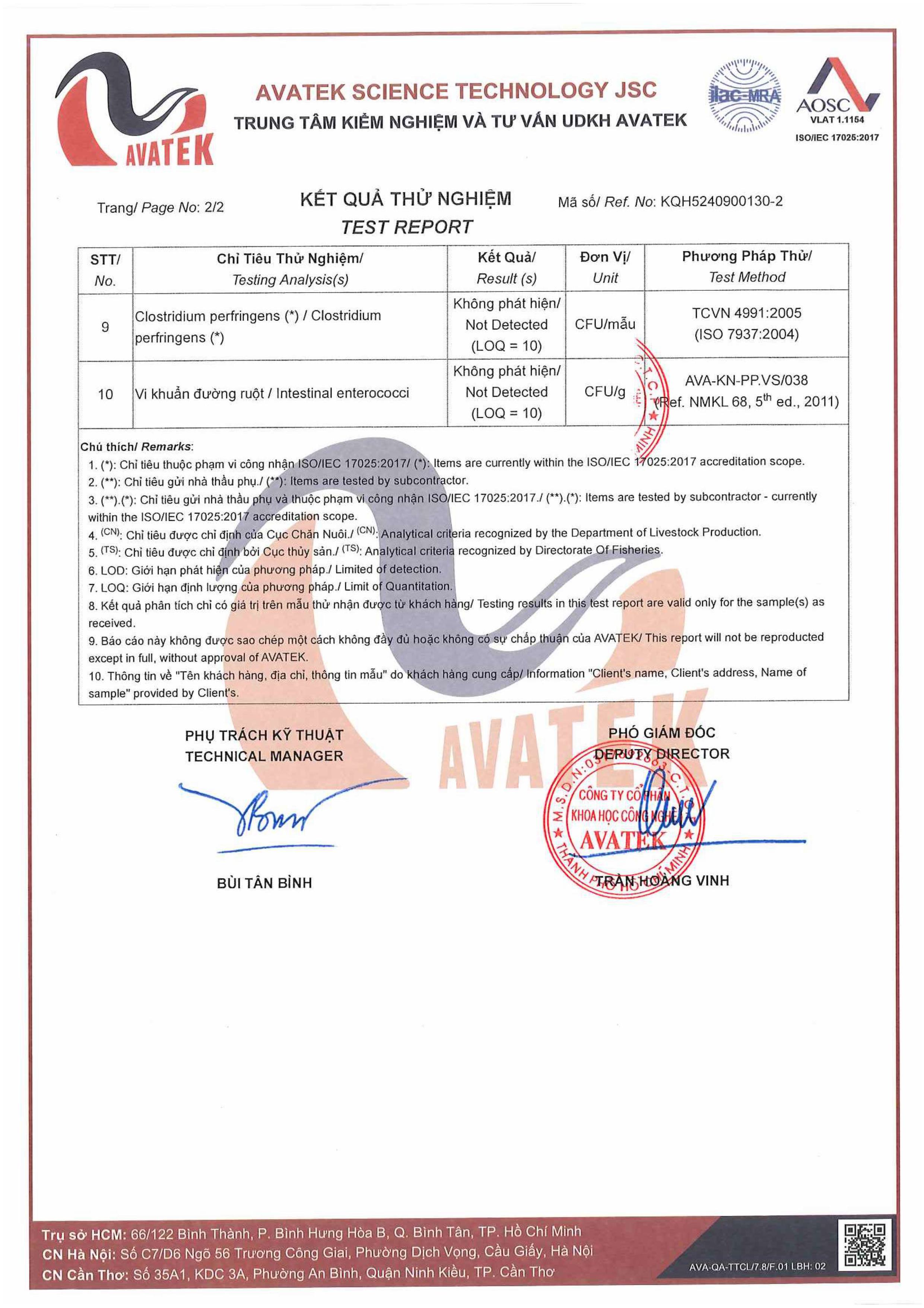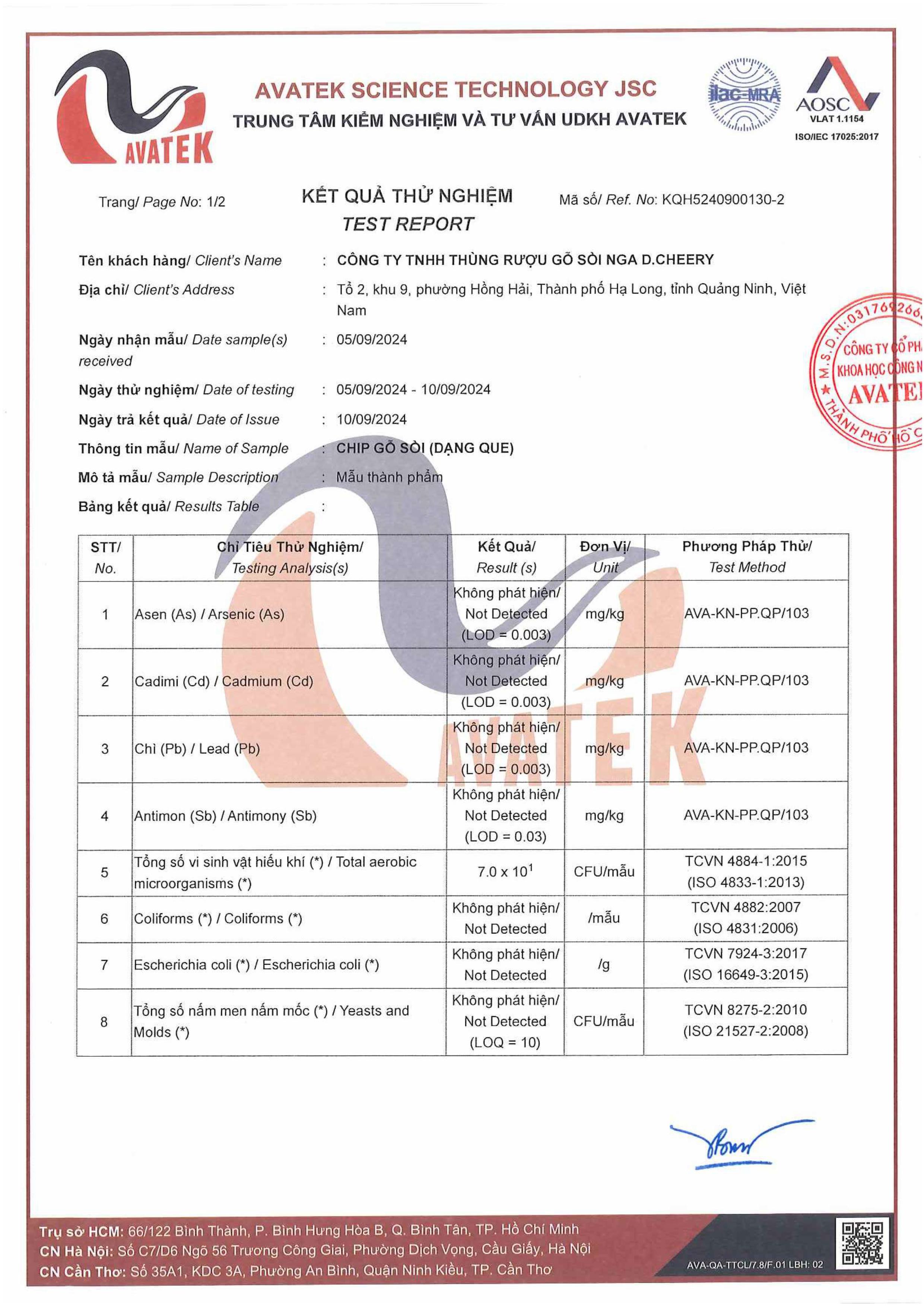 Giấy kết quả thử nghiệm về Chip gỗ sồi của Trung tâm Kiểm nghiệm và tư vấn UDKH AVATEK