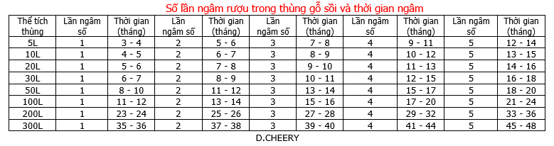 - Số lần ngâm trung bình là 5 lần. Từ lần thứ 6, 7 trở đi các thành phần từ gỗ sồi chuyển sang rượu đã giảm 90%. Khi đó thùng phù hợp để bảo quản rượu thành phẩm.