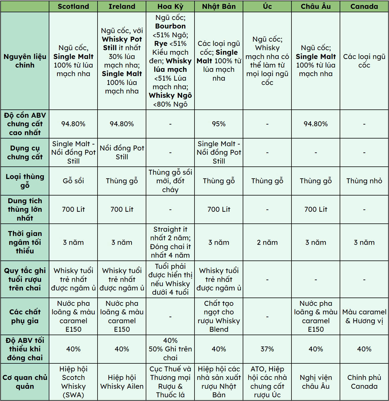 Bảng quy định về việc sản xuất rượu Whisky theo từng quốc gia