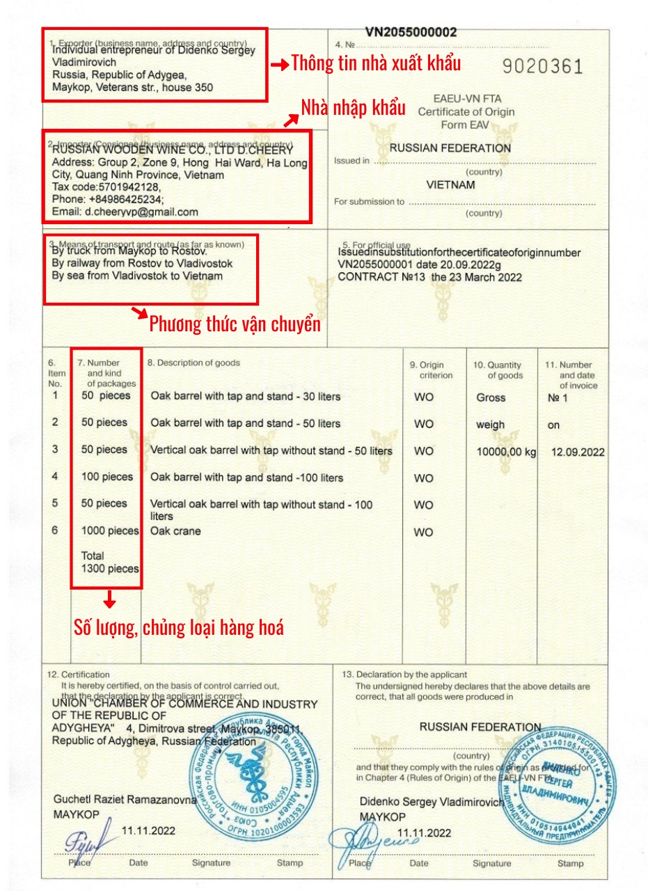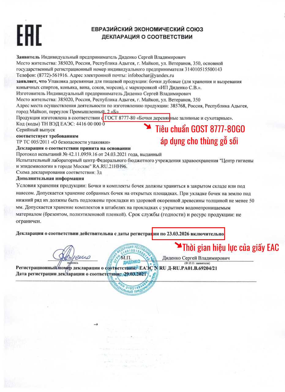 Dưới đây là bộ giấy tờ chứng nhận dành cho Thùng gỗ sồi nhập khẩu nguyên chiếc Nga D.CHEERY: