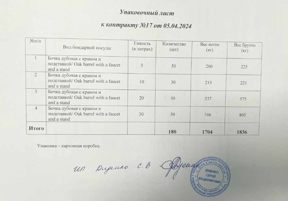 - Danh mục hàng hoá nhập khẩu: Chứa thông tin về số lượng, kích cỡ sản phẩm. Ở đây là thùng gỗ sồi (OAK BARREL) với các kích thước 30L, 50L, 100L ....