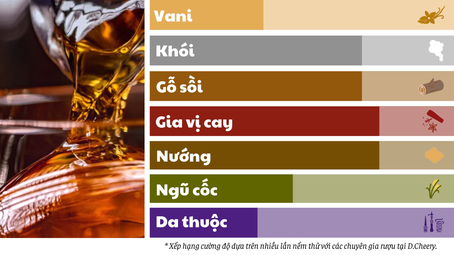 Khói: Hương vị của khói mang đến cảm giác nồng nàn, ấm áp, với nét đặc trưng của than gỗ cháy. Khói tạo ra sự mạnh mẽ, đầy cá tính cho rượu, giúp cân bằng với những nốt ngọt ngào và thêm phần bí ẩn, quyến rũ.