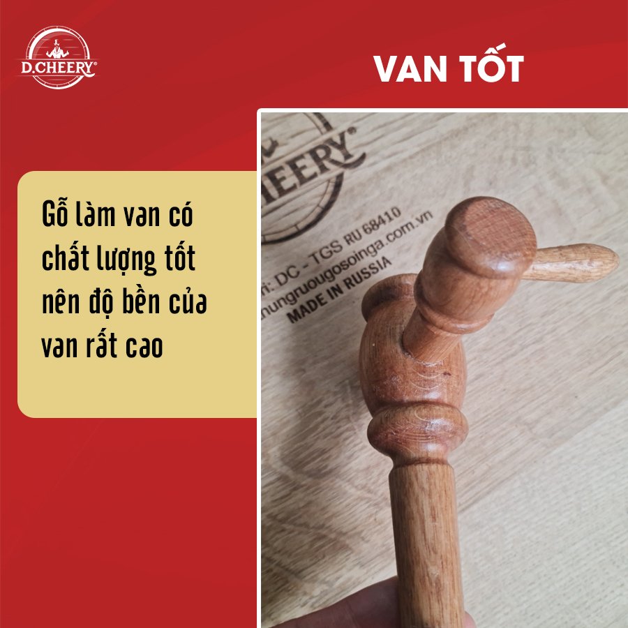 Đây là những chiếc van gỗ sồi được làm nên từ những cây gỗ sồi có tuổi thọ cao trên 80 năm, đây chính là loại gỗ được dùng để sản xuất nên chiếc thùng gỗ sồi Nhập khẩu nguyên chiếc Nga của D.CHEERY. Ưu điểm của loại van này là chất lượng gỗ làm van tốt, độ bền cao, chống thấm tốt. Vì vậy bạn hoàn toàn yên tâm khi sử dụng những chiếc van gỗ sồi loại này.