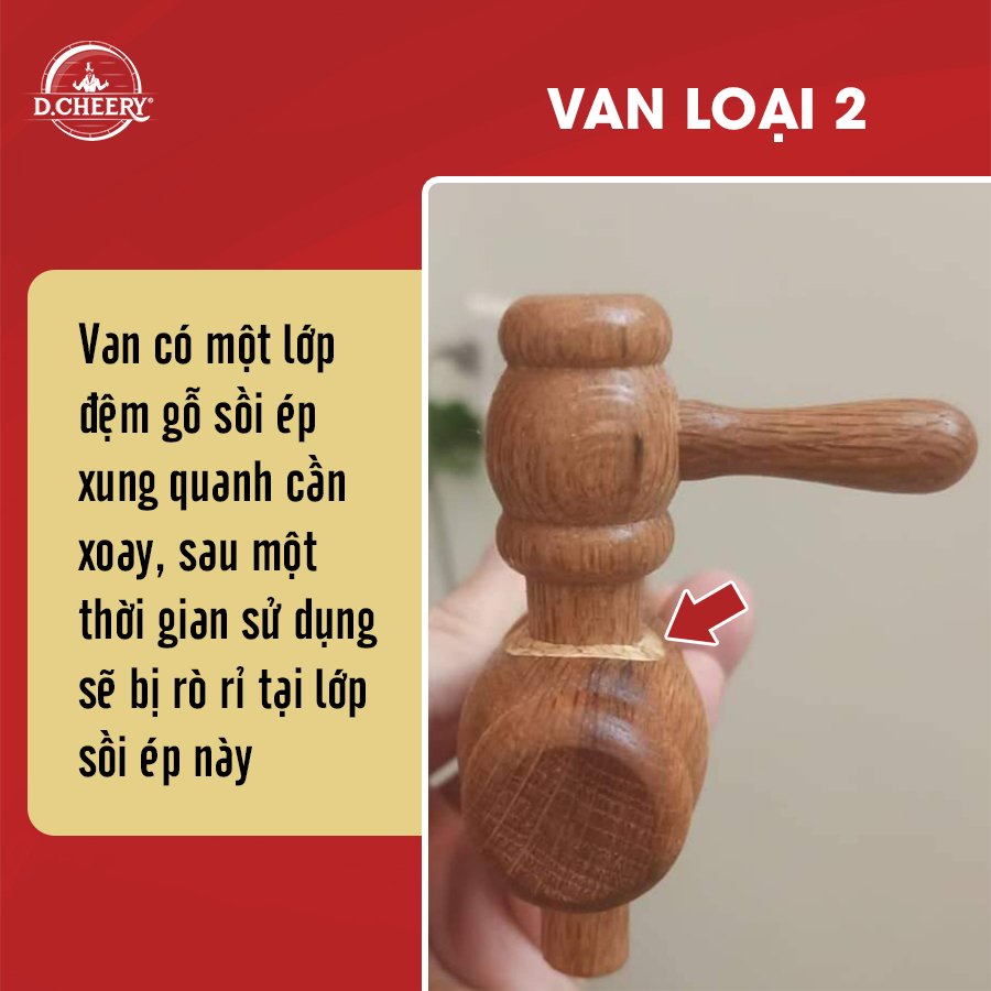 Khi mua phải loại van gỗ sồi này bạn nên cân nhắc có sử dụng hay không vì tỉ lệ rò rỉ là 99%. Những loại van này được làm bằng gỗ sồi xốp và chúng còn có một lớp đệm gỗ sồi ép xung quanh điểm tiếp xúc của cần xoay và thân van. Thân van làm bằng gỗ sồi xốp nên khi sử dụng một thời gian sẽ bị ngấm rượu qua gây rò rỉ. Lớp đệm bằng gỗ sồi ép cũng như vậy, trong suốt vòng đời của 1 chiếc van gỗ sẽ được sử dụng hàng nghàn lần, bạn hãy tưởng tượng khi lớp đệm này ngấm rượu và xoay đi xoay lại hàng ngàn lần chúng có chịu được không? Điều đó là không thể và chúng sẽ bị rò rỉ.
