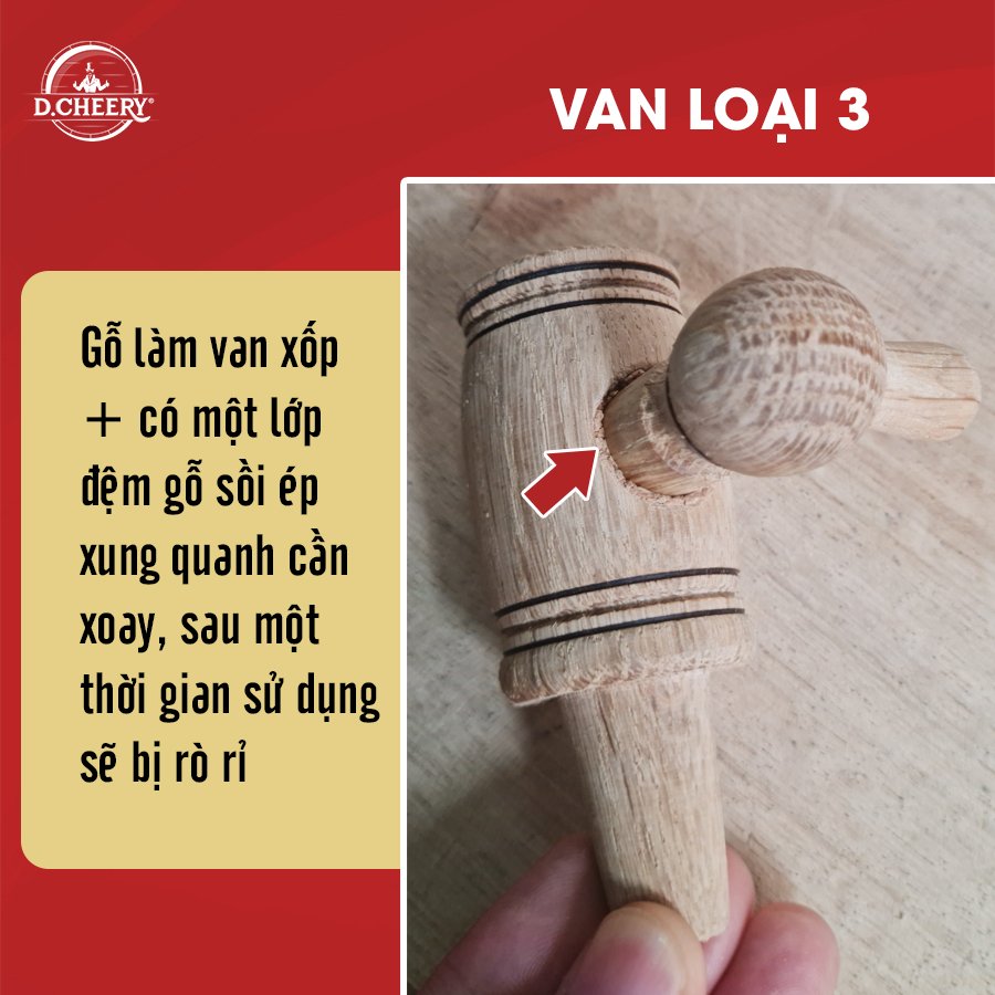 Trên đây là 3 loại van gỗ sồi phổ biến bạn có thể tìm thấy trên thị trường hiện nay. Với ưu nhược điểm rõ ràng như vậy, D.CHEERY tin rằng bạn sẽ lựa chọn được loại van gỗ tốt cho chiếc thùng gỗ của mình và giúp bạn có một trải nghiệm sử dụng thùng gỗ sồi cũng như thưởng thức một hương vị mới từ rượu được ngâm ủ trong thùng gỗ sồi của bạn.