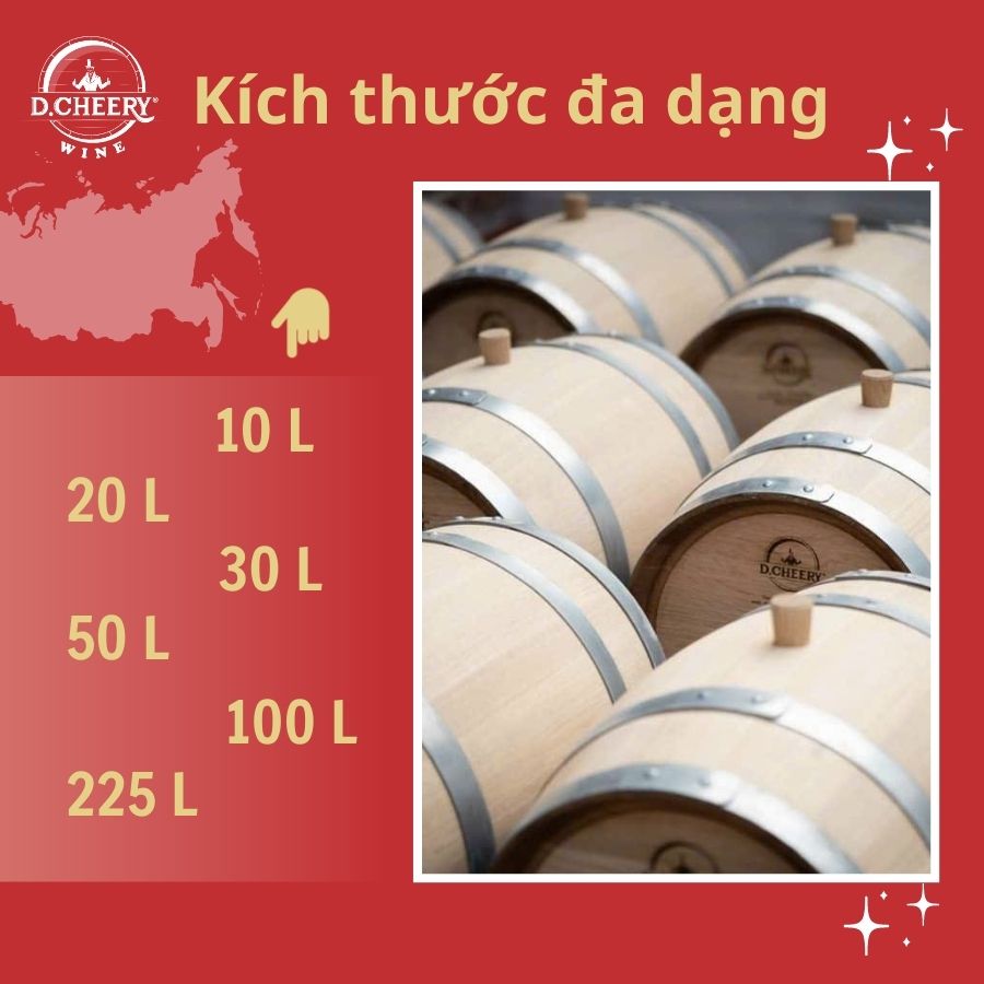 Kích thước của thùng rượu phải phù hợp với nhu cầu sử dụng của bạn, không nên mua những sản phẩm có kích thước lớn hơn so với dung tích rượu để tránh lãng phí. Hiện nay, Thùng gỗ sồi nhập khẩu D.Cheery có các kích thước mẫu mã phù hợp với nhu cầu sử dụng của quý khách: 10L, 20L,30L,50L, 100L đến 225L.