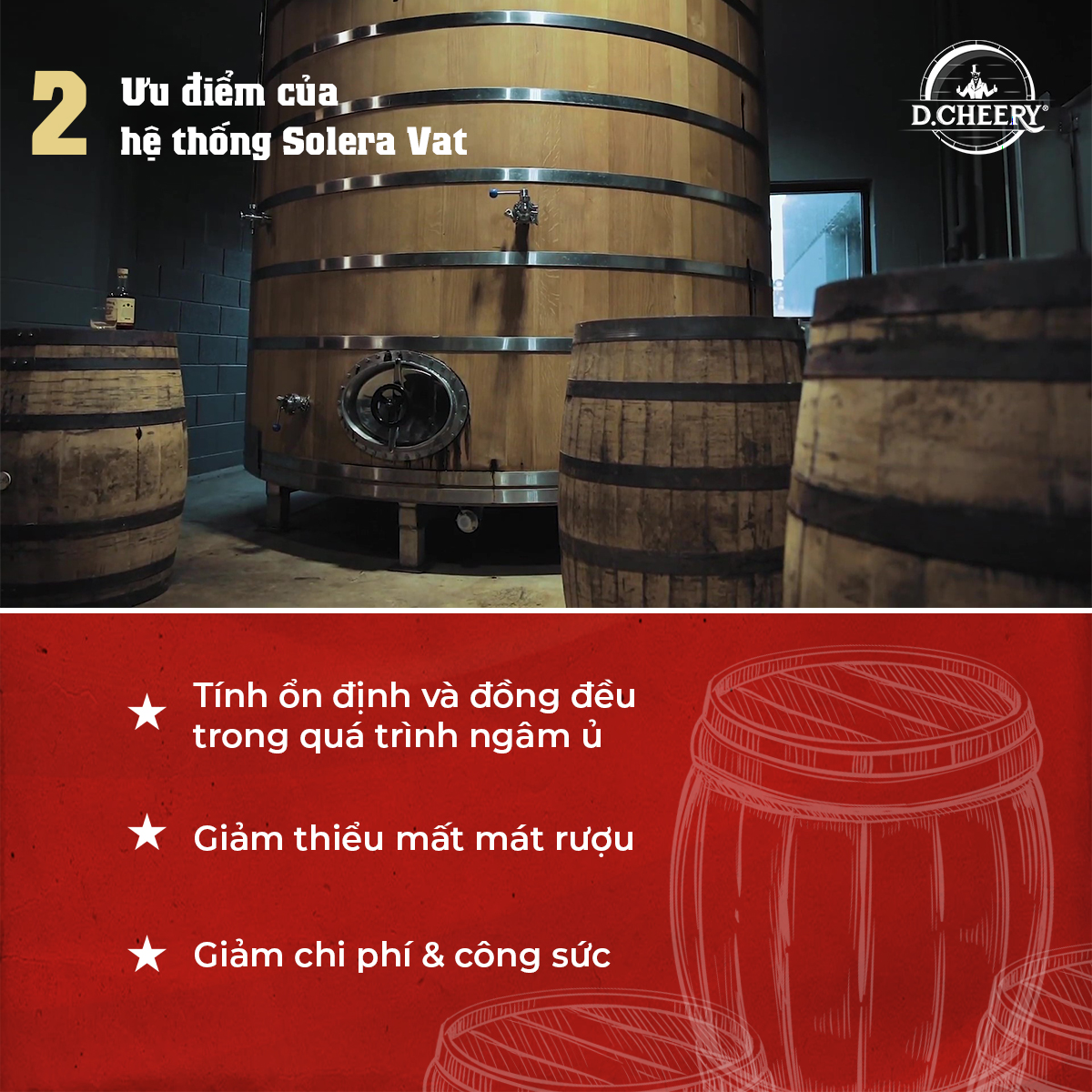 Giảm chi phí và công sức: Hệ thống Solera Vat giúp tối ưu hóa quá trình ngâm ủ, không cần thay thùng, không cần phải chuyển rượu qua nhiều thùng, từ đó giúp tối ưu hóa quy trình ngâm ủ, tiết kiệm công sức và thời gian.